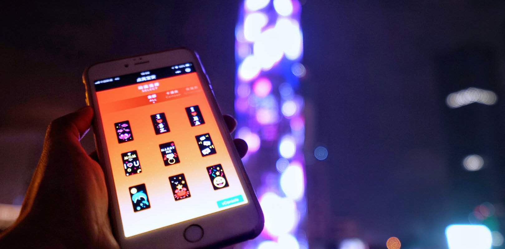 游客通過定制的“點亮寶安”微信小程序可定制不同的圖案和視頻效果進行顯現。