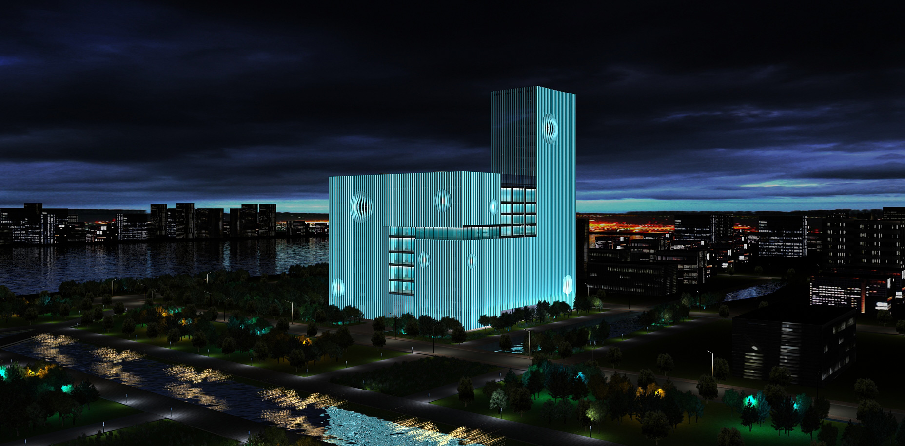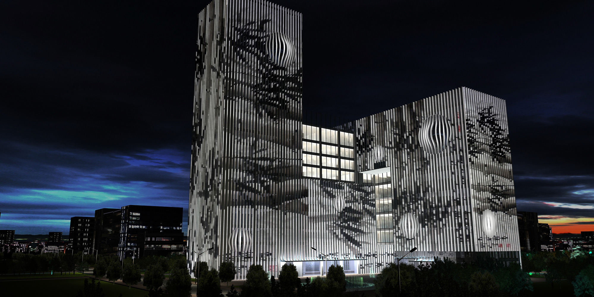 富陽電力大廈位于富陽鹿山區CBD板塊。燈光項目完成后,建筑整個外立面變成巨大的展示屏,在夜晚展現繽紛色彩,極具吸引力。