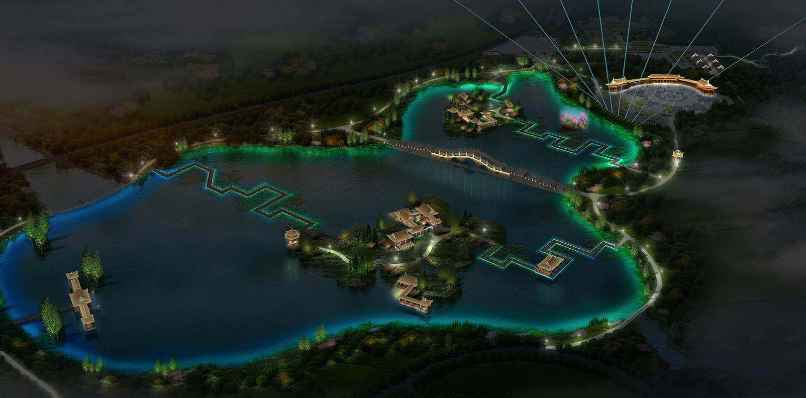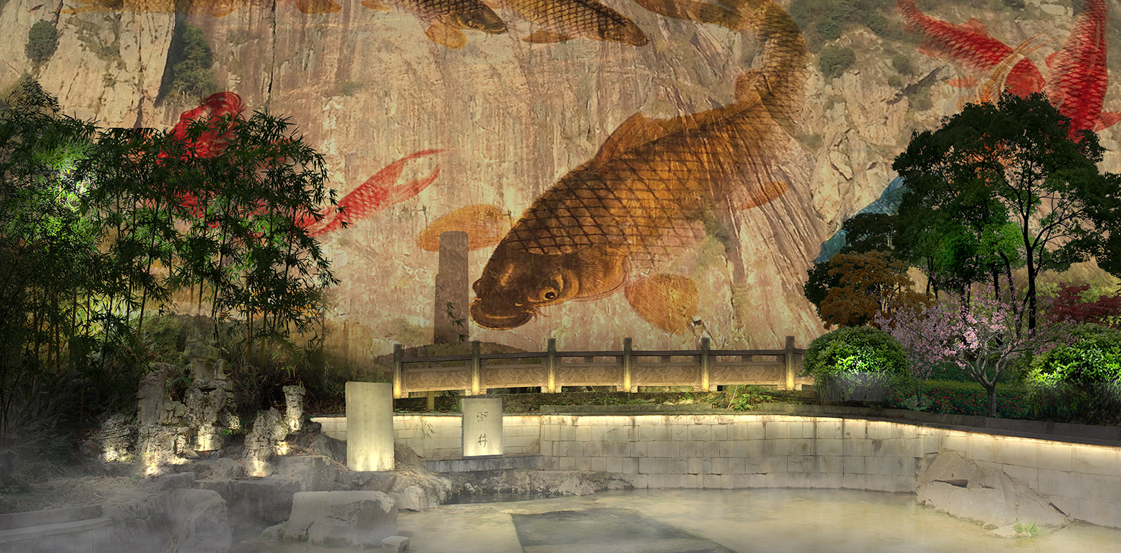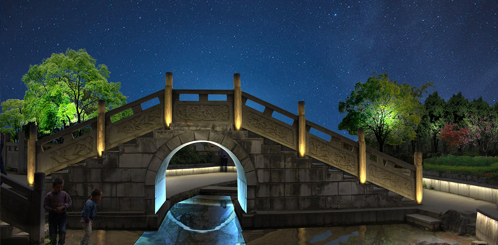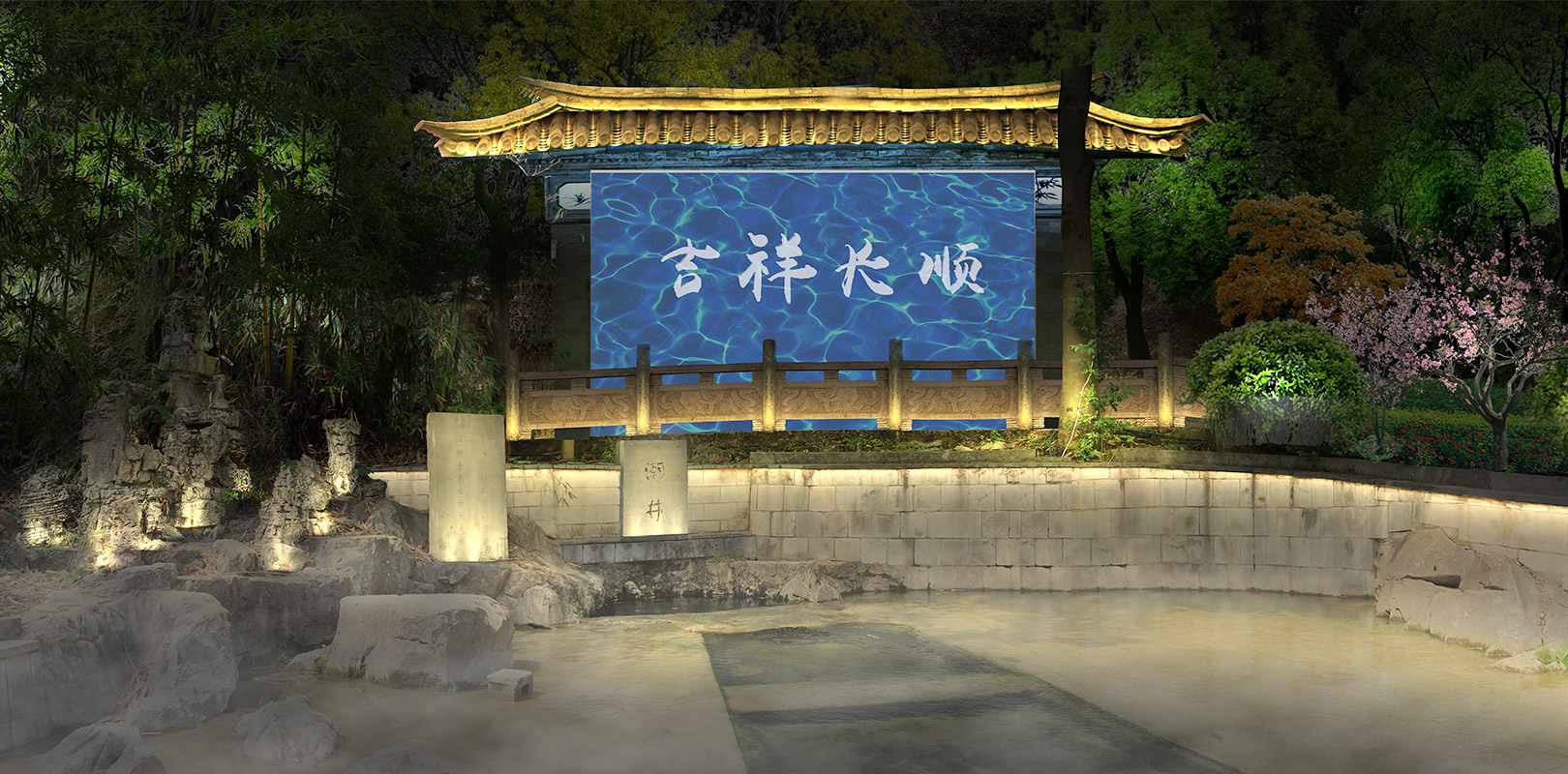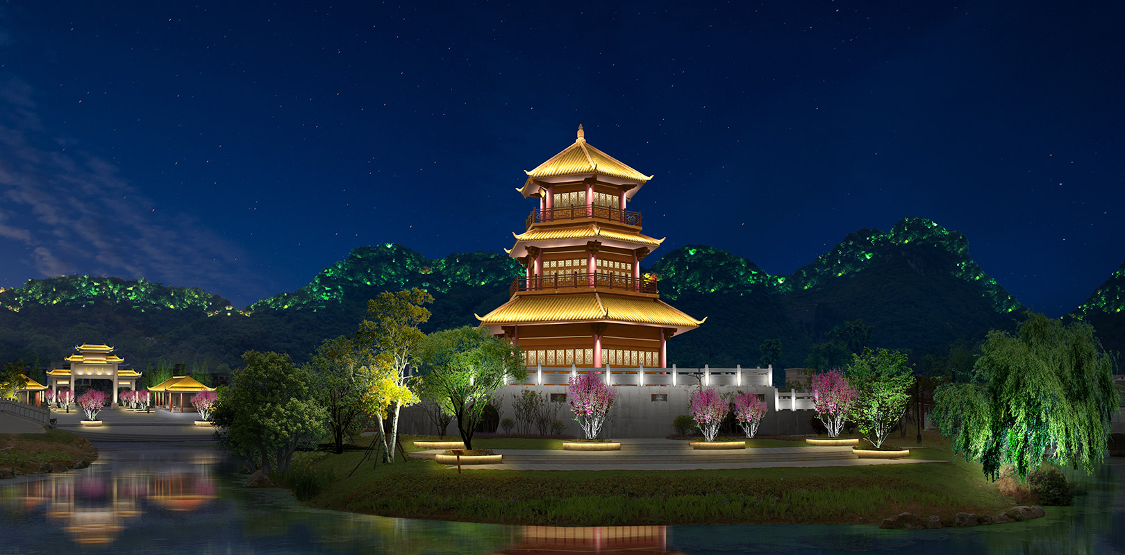 整合景觀空間、獨特色調、色彩層級與總體氛圍調配燈光色彩,增強景區美感,讓景觀富含文化及情趣。