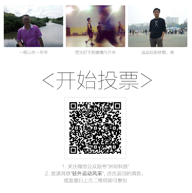 活動說明:本次運動風采展示活動將評選出30張最具運動風采的照片,其中個人照20張,集體照10張,照片得分根據網絡投票得出,本評選接受公司內部及社會公眾網絡投票,并且可多投,誰奪冠,你的手指說了算,欣賞最美運動圖景,為你心目中最具運動風采的選手投上你珍貴的一票吧! 獎項設置:入選照片獎金設置為:個人運動風采獎150元/張,集體運動風采獎200元/張。 投票方式 (微信投票):1. 關注微信公眾賬號"洲明科技"2. 發送消息"駐外運動風采", 點擊返回的消息即可參加