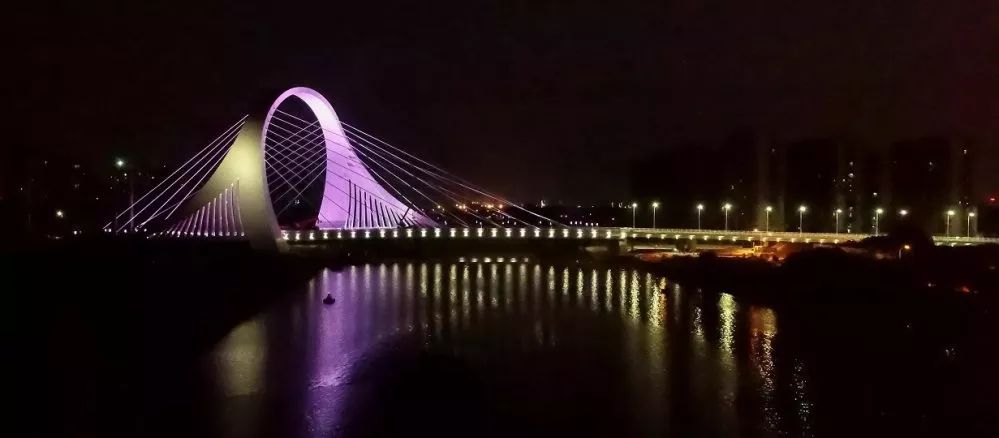 如墨夜色下,呈現(xiàn)明暗、多彩變幻的淮安運(yùn)河大橋,如同水面上一顆璀璨閃耀的夜明珠,美輪美奐。