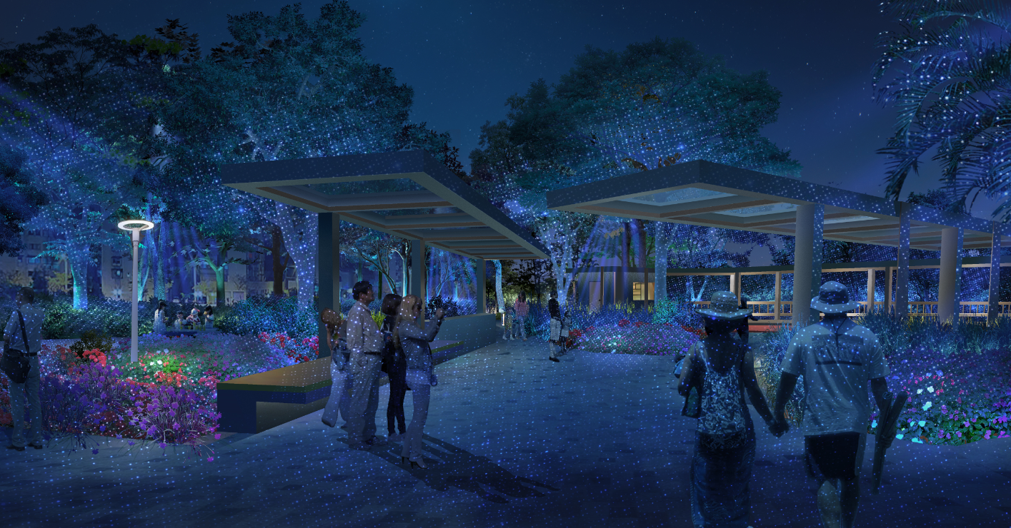 天光水影:月光在水里跳動,水紋燈的光波在樹梢上起舞。如此美景,或與家人漫步其中,或與三兩好友愜意駐足。無論如何,都是人生難得休憩事。