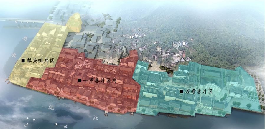 本案照明設(shè)計內(nèi)容為洪江古商城核心景區(qū)“煙雨洪江”的建筑以及景觀照明。項目用地呈“7”字形,東、北兩面分別臨巫水和沅江,南面、西面為洪江古商城核心景觀區(qū), 分為犁頭咀片區(qū)、一甲巷片區(qū)、萬壽宮片區(qū)。