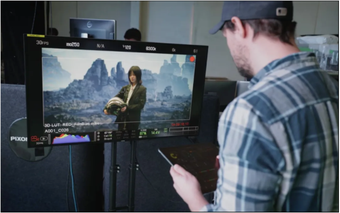 現(xiàn)場每個(gè)人都能夠身臨其境的看到正在進(jìn)行的拍攝,攝影師可像拍攝實(shí)景一樣工作,演員也無需對(duì)著代表假想圖像的標(biāo)記進(jìn)行表演:虛擬的實(shí)景就在眼前。