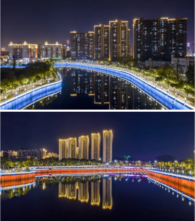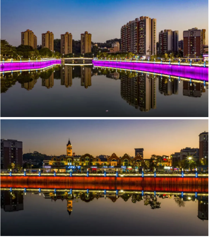 東莞市鳳崗鎮(zhèn)核心主城區(qū)文創(chuàng)燈光項目范圍覆蓋“一河、兩岸、三橋”,分別為石馬河兩岸河堤、綠化帶、步道及臥龍橋、永盛北大橋、永和橋。