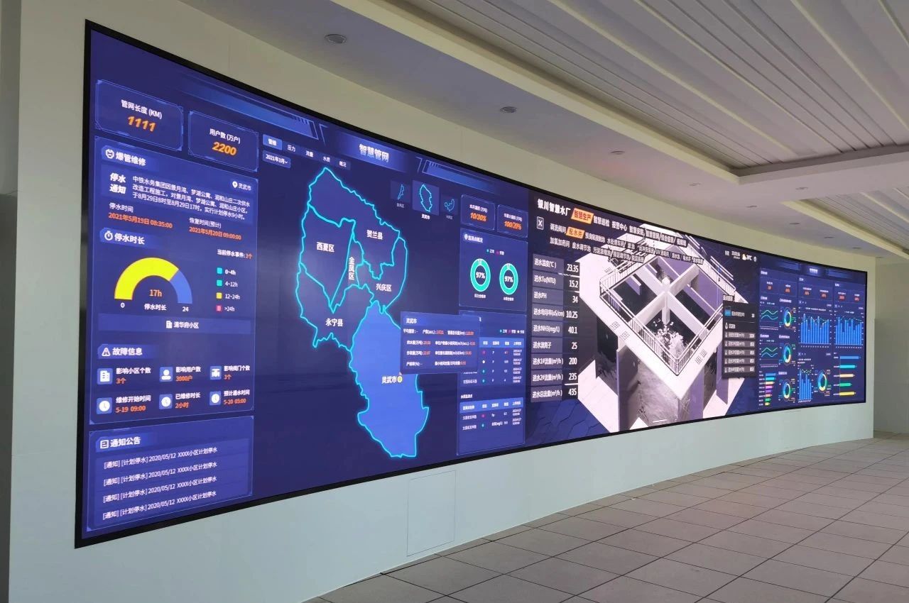 銀川都市圈城鄉西線供水項目2018年開工建設,一期總投資高達76億元,興建(改建)了取水泵站、水渠、河渠、凈水廠等大批基礎設施,并打造智慧水務一體化平臺,在數字化上下足了功夫。其中,智慧水務平臺的LED顯示大屏及顯控解決方案均由洲明提供。
