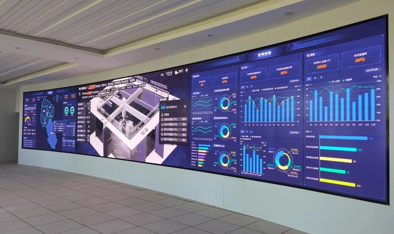 通過項目指揮中心的洲明UMini大屏,我們可以一目了然的對水庫運營、制水運營、管網運營、供水服務、水質管理等信息進行可視化管理,并通過與市政、水務等部門的互聯互通,實現生產、調度、服務監管的全業務流精細化管理。