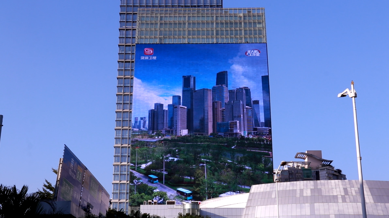 ▲深圳廣電大廈。4501㎡“灣區之窗”,亞洲大戶外顯示屏,洲明科技出品。