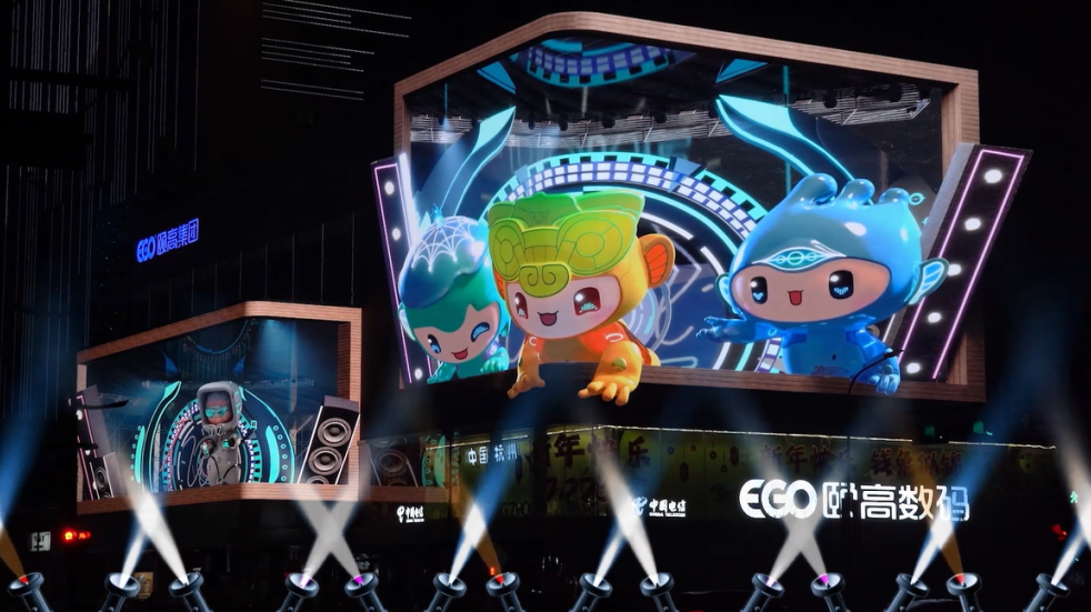 看,配備LED超高清技術的賽事場館、亞運吉祥物跳躍而出的杭州文三裸眼3D大屏……