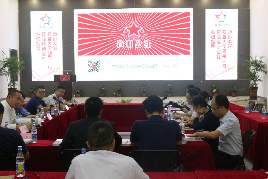 圖為造明公社相關領導和復旦大學考察團展開合作研討會