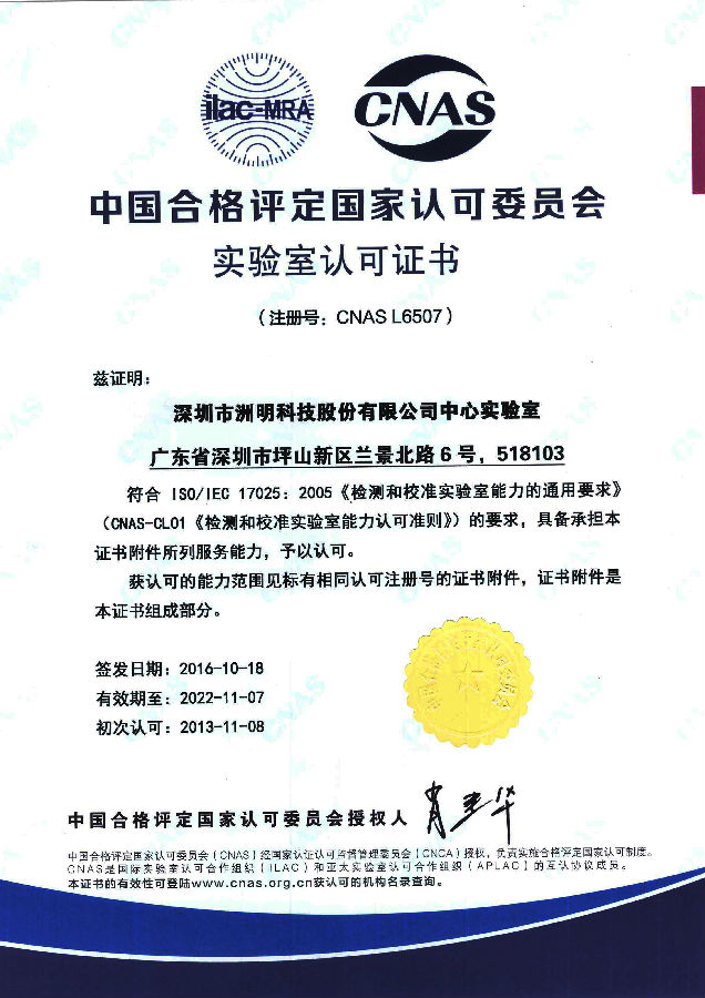 2016年10月18日,深圳市洲明科技股份有限公司中心實驗室順利通過中國合格評定國家認可委員會(CNAS)的復評審暨擴項評審,近日已收到CNAS頒發的認可證書(證書編號:L6507)。