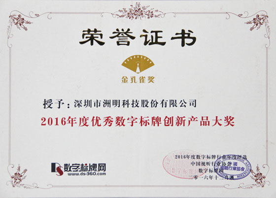 “金孔雀獎” 是數字標牌行業的大型評選活動,現已成為行業內最權威的獎項。此次2016年度數字標牌行業金孔雀獎評選活動歷時近三個月,經過網上投票、專家評審并經組委會核準后,小間距領軍品牌—洲明科技以領先的創新研發實力從眾多的參評企業中脫穎而出,榮獲“2016年度創新企業大獎”,其創新性智能小間距LED顯示屏UHQ系列以多個“智能化”首創設計引領行業發展新潮流,榮獲“2016年度優秀數字標牌創新產品大獎”。