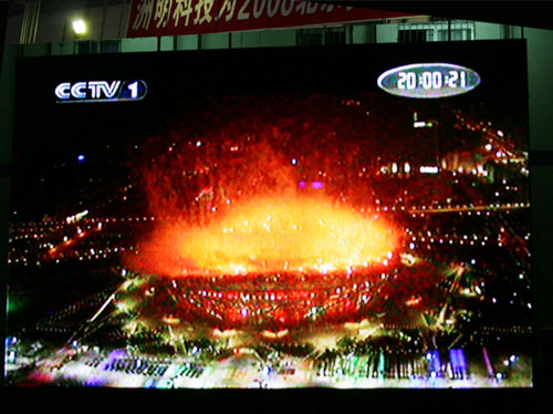2008年8月8 日晚8點8分的開幕式,全國人民都在期待,洲明公司也提前安裝調試好一塊超大的LED戶外全彩顯示屏,裝好音響功放,拉好有線電視信號.公司行政部專門為 每個員工訂制了一面面奧運五環(huán)旗幟和中國國旗,買來飲料和水果.隨著夜幕的降臨,LED超大屏幕在整個工業(yè)區(qū)顯得格外醒目耀眼,在如此氣氛的感染下,公司 周圍的不少居民也紛至沓來,駐足觀看,共同感受奧運直播這一偉大時刻.