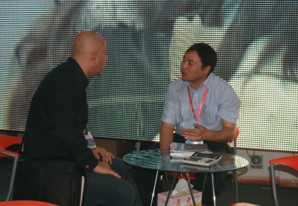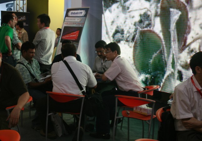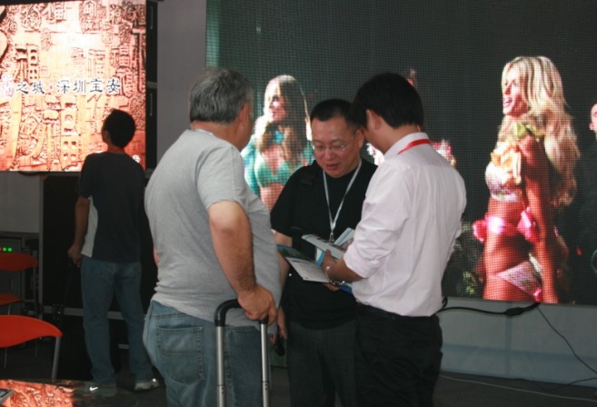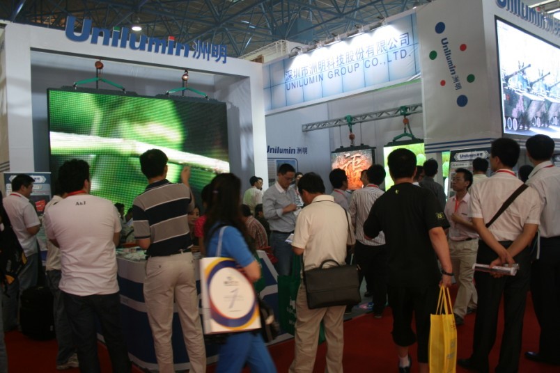 5月20日,展會乍一開始,洲明科技展示的各色全彩顯示屏就深深吸引了人們的眼球,令不少觀眾駐足觀看,流連忘返,一時間洲明展臺前人頭攢動,負責接待的工作人員更是應接不暇。展會現場,P6、P4兩種規格的顯示屏猶具吸引力,成功吸引部分客戶現場訂下意向訂單,并決定在展會結束后即到公司來考察。
